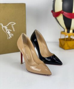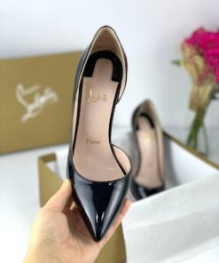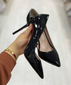 - Patent leather heels in black.
