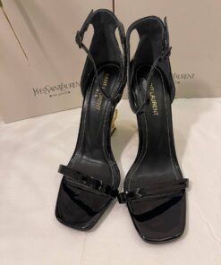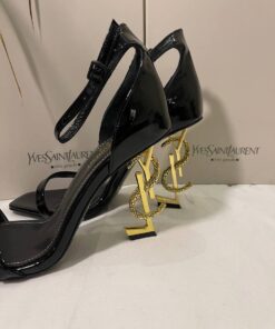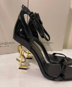 Sleek patent leather ankle-strap sandals with a goldtone sculpted logo heel.