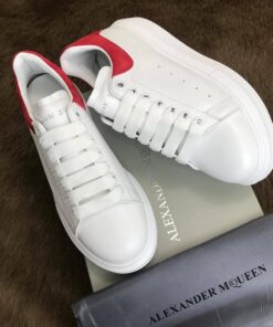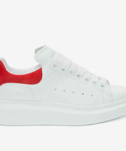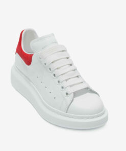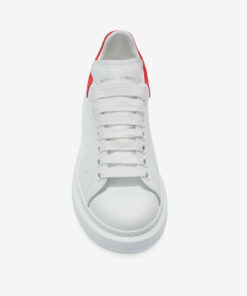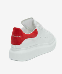 White smooth calf leather lace-up sneaker with rounded toe and trimmed with crimson red suede heel detail.